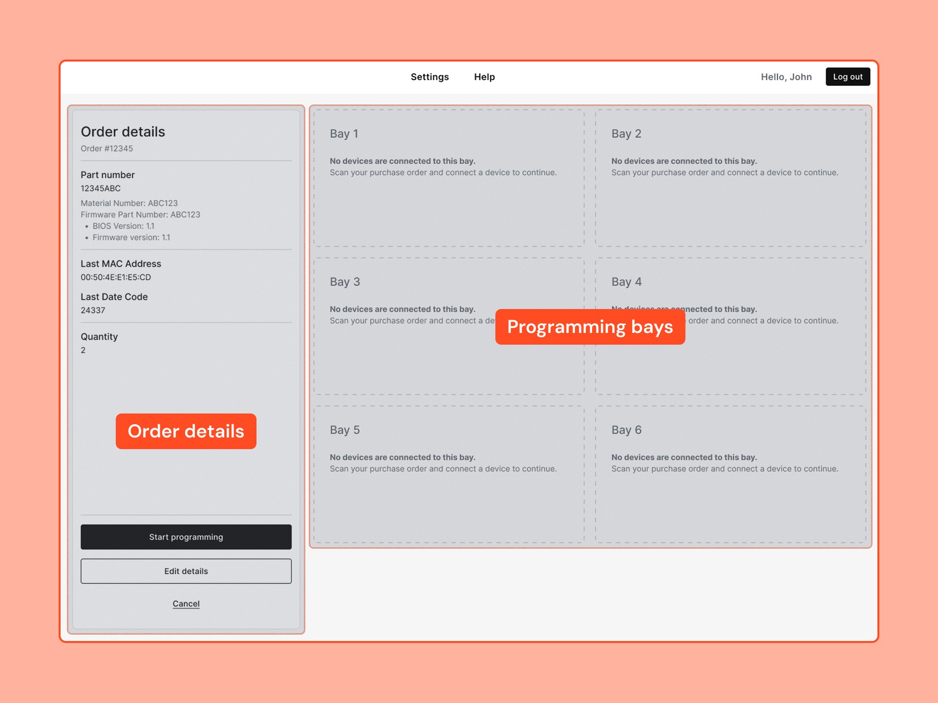 After technicians load the order details, they will physically connect the blank IoT devices to the programming bays using several wires.